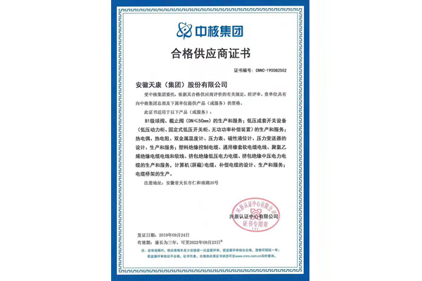 中核集团合格供应商证书