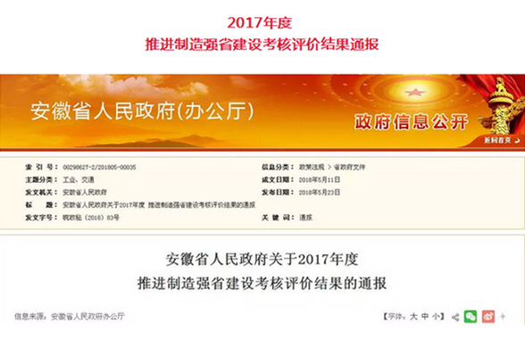 5月25日,2018世界制造业大会和2018中国国际徽商大会将在合肥拉开帷幕。安徽省人民政府于5月23日对外发布了2017年度推进制造强省建设考核评价结果,安徽pg电子赏金女王游戏集团上榜2017年度安徽省制造业综合实力50强企业名单;pg电子赏金女王游戏集团董事长赵宽被授予2017年度制造业优秀企业家荣誉称号。