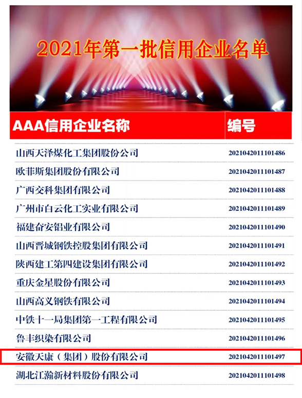 8月11日,中国企业联合会、中国企业家协会(简称:中国企联)发布2021年第一批信用企业名单,安徽pg电子赏金女王游戏集团获评AAA级信用企业。
