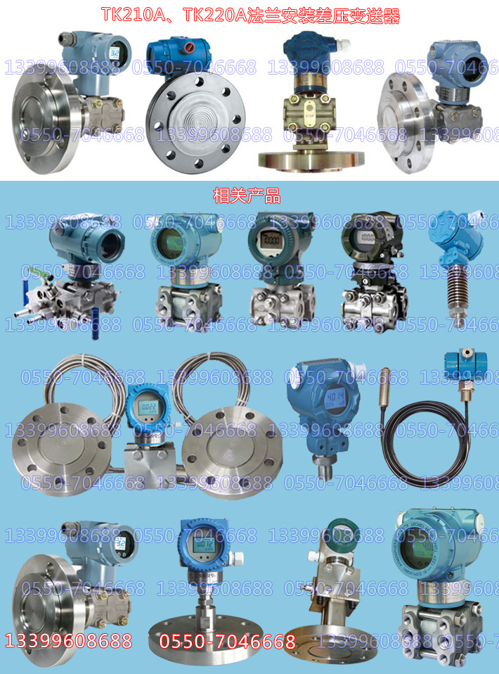 TK110A型差压变送器、TK120A微差压变送器、TK130A高静压变送器、TK210A、TK220A法兰安装式差压变送器、TK310A绝对压力变送器、TK430A压力变送器、TK510A&530A绝对压力/压力变送器、TK118W、N、Y隔膜密封式差压变送器、TK438W、438N隔膜密封式压力变送器、量程比:100:1、精度高:±0.075%、智能:HART现场总线协议、低温漂:数字温度传感器自动补偿、规格全:-100Pa~0~100Pa~100Mpa、耐压性能好:常规14MPa、高静压32MPa、耐腐蚀:提供316L、哈氏合金、钽等、防爆:本安型(ia ⅡCT4/T6、)隔爆型(d ⅡCT4/T6 )